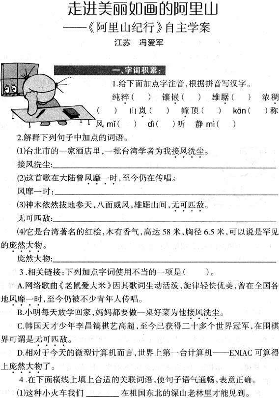 知识解析二:课文之所以能为读者展现阿里山如画的美丽风光,在于作者能抓住景物的特征进行描写。如阿里山小火车站——不同寻常的古典文化氛围,林海深处——潭水清澈、林区宁静、曲径幽路、森林无边,神木——巨大、神奇、悠久。这些富有特征的鲜明的画面,构成了“阿里山的风光美如画”的共同特征——幽深、宁静、清凉、神奇,体现了祖国山河的无比美丽。
