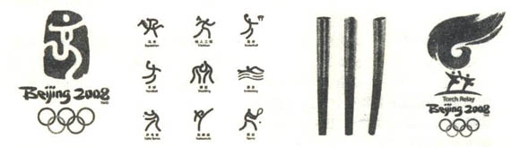 北京2008年奥运会体育图标以篆字笔画为基本形式,融合了中国古代甲骨文、金文等文字的象形意趣和现代图形的简化特征,符合体育图标易识别、易记忆、易使用的要求。