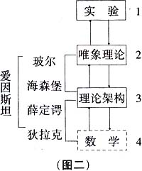 海森堡和狄拉克的风格为什么如此不同?主要原因是他们所专注的物理学内涵不同。为了解释此点,请看图一所表示的物理学的三个部门和其中的关系:唯象理论(2)是介乎实验(1)和理论架构(3)之间的研究。(1)和(2)合起来是实验物理,(2)和(3)合起来是理论物理,而理论物理的语言是数学。