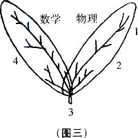 让我补充一点关于数学和物理的关系。我曾经把二者的关系表示为两片在茎处重叠的叶片(图三)。重叠的地方同时是二者之根、二者之源。譬如微分方程、偏微分方程、希尔伯特空间、黎曼几何和纤维丛等,今天都是二者共用的基本观念。这是惊人的事实,因为首先达到这些观念的物理学家与数学家曾遵循完全不同的路径、完全不同的传统。为什么会殊途同归呢?大家今天没有很好的答案,恐怕永远不会有,因为答案必须牵扯到宇宙观、知识论和宗教信仰等难题。