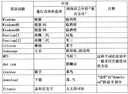仔细一看我们不难发现,以上这些网络词汇和“粉丝”有着惊人的相似之处:第一,这些汉译的意思都与英语原词的意思风马牛不相及;第二,这些汉译都是在已有通行译法的情况下新生出来的;第三,其新生的依据不是因为已有通行的译法(不管是音译还是意译)不尽如人意,需要新的译法来弥补这种缺憾,恰恰相反,上述通行译法大部分都是上乘之作,而这些“新兴音译”如用传统翻译标准来评价的话反倒一无是处。如“视窗”这个意译就很好地传达出这种电脑系统直观形象的意味。“奔腾”和“赛扬”这两个音译不仅模拟出了原词的发音,还在择字上下了工夫,用“奔”“腾”“赛”这样的字眼将这两款芯片的速度优势体现得淋漓尽致;而与此对应的“新兴音译”中,“瘟”“死”“屁”“笨”“菜”在汉语里都带有贬义,不仅不是英语原词所要表达的意思,而且完全是在高唱反调。
