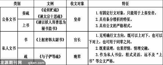 综合以上内容,把其中涉及的以“书”“疏”命名的几篇文章所属的文体及其属性列表如下,作为本文的总结: