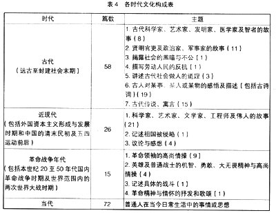 几千年的人类历史有着丰厚的文化积淀,吸取其中的精华加以传承是语文教材的重要使命。整套教材中可以确定某一时代文化内容的课文有171篇,具体见表4。
