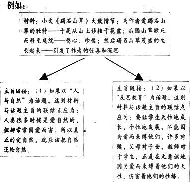 传统的写作教学尤其强调主题与材料的统一,这是很有必要的。无论我们进行怎样的教学改革,对文章的要求都不会排除这一点。而真正做到这一点又绝非把某个材料与某个文题进行生硬的派对,而是让话题与材料在不同的个体思维程序里产生不同的链接,在同一个体的不同思维环境里搭上线头通起电来。只有这样,主题与材料才能够真正统一,其链接才会严正紧密而又灵活开放。