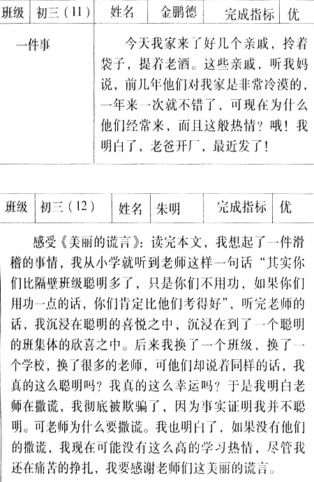 根据这张表格,可以要求学生每天完成其中的一项,而阅读的评价不是由老师来评价的,而是留给学生自己去评价,一个个“优”字体现了学生对这张表格的重视,也折射出学生一种自我收获的喜悦感。事实证明,学生的表格阅读还是值得咀嚼的。如: