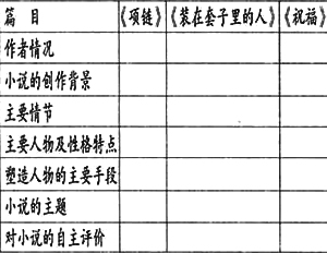 在这个表中,我们将小说的复习任务进行了分解,使得一个总的小说阅读任务变成了几个小任务,让学生自己去独立完成。“作者情况”、“创作背景”两项让学生自己查阅资料解决,并能根据作品内容谈谈作者的人生和理想等,培养了学生的思辨能力;“主要情节”则需要学生在阅读作品之后进行概括形成,需要一定的知识概括和整合能力;“人物性格特点”和“塑造人物的手法”的分析把握,又是对学生运用所学文学知识解决实际问题、鉴赏文学作品能力的训练和培养;“小说的主题”和“对小说的评价”则是培养学生高级思维能力,训练学生学会批判性思维。同时,利用这样的表格,为学生提供了一个阅读鉴赏小说的基本方式和步骤。人物的选择和分解也可以由学生自己来做,这样又培养了学生解决问题的实践能力。