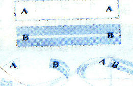 “你们看这个东西。”莫比乌斯说着用纸裁出一个长条,在纸条的一面涂上颜色,标为A面,把反面标为B面(如图)。接着,他又把纸条拧转了180°,让A面对着B面,用浆糊把纸条的两端粘接在一起,形成了一个扭转的纸带圈。
