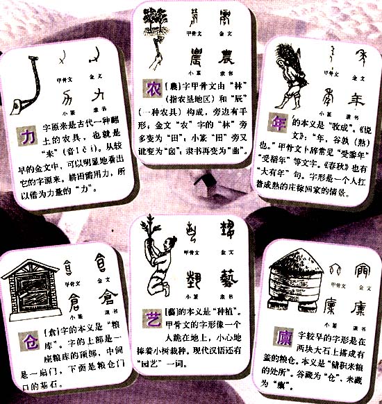 自古以来我国就是一个农业大国,因此汉字中有关种植、耕耘、收获、储藏的字很多。但是,由于语言的发展变化,有些字的古今字义相差较大,例如下面提及的“力”“年”“艺”等。