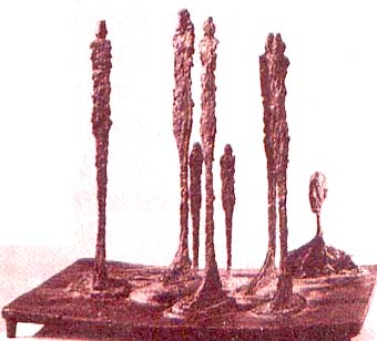 一个个像棍儿似的立着的人体,雕塑以高度概括、高度简化的奇特造型而使人大感惊异。这是瑞士雕塑家贾科梅蒂(1901~1966)的作品。