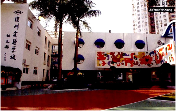 楼体外观以蓝、白为基调,圆的窗,圆的阳台,透着柔和、朴实、明朗、现代的意蕴;二楼顶雕塑《海阔天空》,呈海浪形,配以太阳花柱,波浪由低到高,向太阳升起的地方延伸,如礪礴的海,像腾飞的龙,代表幼儿部以海一样的博大胸怀,接纳和拥扣特区儿童。雕塑以“乘风破浪会有时,直挂云帆济沧海”的气势,寓意着幼儿部在千帆竞发、百舸争流中,不断进取,永不满足,以昂扬的姿态拥抱美好的明天。