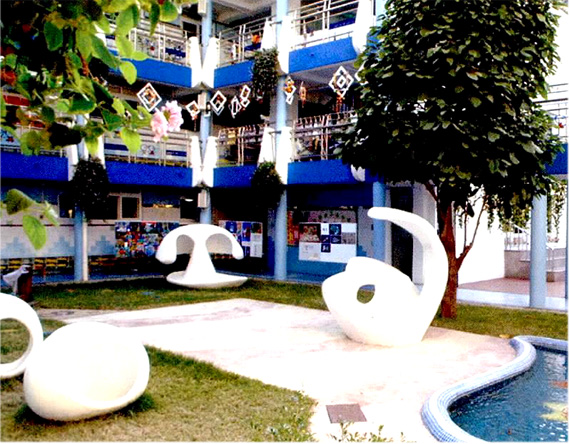180平方米的中心庭院,建造了艺术雕塑《源园》。纯白色组雕,以“圆”为主要造型,由水滴、极为抽象的胎儿、有力的翅膀、蛋壳雕塑体组成,营造出“纯美的生命之源,源远流长”的意境,暗喻了幼儿部能够给孩子们提供一个纯美、安全、温暖、幸福的成长环境,也象征幼儿部是“开启智慧,引领成长,塑造未来”的一方圣地。整个雕塑群朴素简洁,集艺术性和实用性为一体,既有强烈的现代感,又富有童趣、既有风格独特的视觉效果,又适合幼儿玩游戏、捉迷藏。