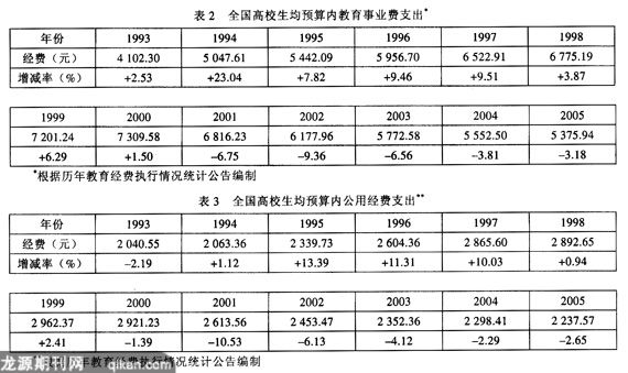 5,生均教学经费持续下降。几年来高等学校学生规模迅速上涨,而教学经费投入却没有跟上,以致2000年以后,预算内生均教育事业费支出年年减少(见表2),特别是直接关系教学条件的生均预算内公用经费的减少(见表3),无异于教学条件恶化。