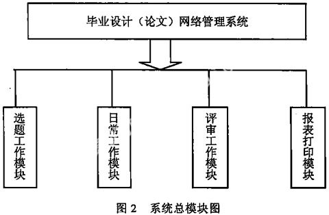 (3)程序设计。本系统需要实现毕业设计(论文)教学管理的整个工作流程,要完成提交论文选题、管理论文材料、论文评审分组、论文评分、打印工作所需材料等一整套业务。并对系统的所有功能模块进行测试,在系统试运行期间调整、修改程序。系统总的模块如图2所示: