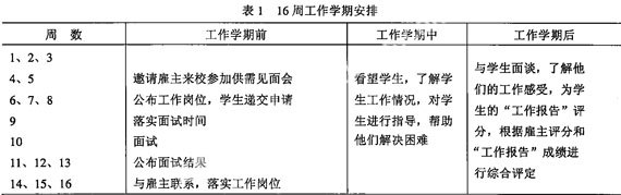 上海有一个职业见习计划,政府将没有找到工作的毕业生安排到一些企业进行职业见习,时间一年,工资每月几百元。学生的关系还在学校,不是正式职工。工资由政府支付,不是企业给。这是社会主义的优越性,上海此举很出名。如果与工作相结合的学习这个模式做好了,学生也许用不着再去麻烦政府。如表1所示,是一个流程图,分成工作学期前、工作学期中、工作学期后,每部分4个月或16周,加起来12个月。在工作学期前,学校要做很多事情:把雇主请到学校,学生面试、相互选择等等。工作学期当中,学校的联络员去看望、关心、指导这些学生。这些联络员是从工厂、公司来的,对工厂公司都很熟悉,实际上就是双师型教师。工作学期后,学生都要写一个业务报告。很多学生都能参加企业某个项目,因此很多业务报告是有关在这个项目里所完成的工作。