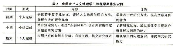 人文地理学课程现已建立理论知识与应用能力相结合、口试与笔试相结合、过程与结果并重的综合测评法。首先,在考试内容上,不仅考察学生的记忆、理解的程度,还关注他们的知识应用与创新水平。其次,在学生个人课程总成绩中不仅包括期中和期末的考试成绩,还包括平时作业和野外实习结果。为了不增加学生过多的学习负担,有效地完成学习任务,每门课程约有三次作业,而且采取个人作业和小组集体作业两种形式。表3以人文地理学这门课为例,列出学生作业的主要信息。随着野外课堂教学内容及教学模式的创新,野外课堂对学生的考评也纳入多项因素,包括从准备工作、现场勘探到实习报告完成等整个过程。此外,考试方式也逐渐由笔试转向口试和笔试相结合的方式,期中考试多采用口试,侧重于考查学生对基本知识的掌握及其初步的分析问题的能力(见表4)。