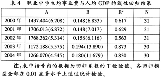 从2000年到2004年B值的变动情况看,各地区职业中学生均事业费的增长速度在加快。B值的不断上升表明每单位人均GDP增长中用于职业中学的数量在不断扩大。同时,这一变动也表明职业中学生均事业费与人均GDP的关系更为密切,而且经济速度增长越快的地区职业中学生均事业费的增速也越快。这种变动趋势表明,职业中学生均事业费的地区差异主要由各地区的经济发展水平的差异决定的。如果各地区经济发展差异继续拉大,现行的教育管理体制和财政体制不变,则各地区职业中学生均事业费的差异将进一步扩大。