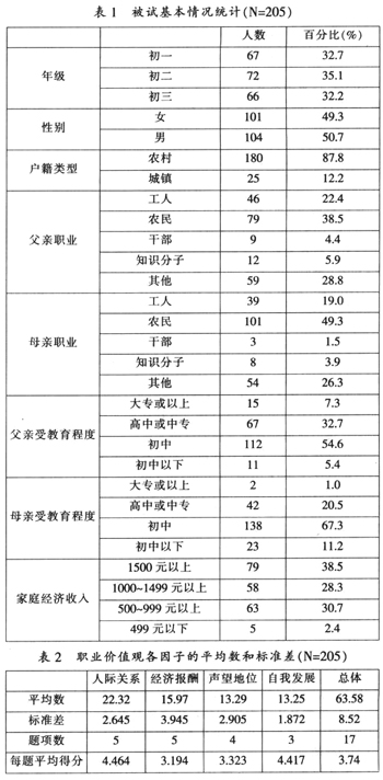 职业价值观是个体依据自身和社会的需要对待职业现象、职业行为和工作结果的相对稳定的一种信念或态度,包括认知、情感和行为,是人生价值观的一个方面,是人生价值观在职业问题上的反映。依据职业发展理论的代表人物,美国心理学家塞普尔(Super,1957)和金兹伯格(Ginzberg,1951)的观点,个体的生涯发展可划分为成长、探索、建立、维持与衰退五个阶段。初中生处在职业成长与探索阶段,是职业价值观形成的初期。处在九年制义务教育最后阶段的初中生,即将面临人生的第一次选择,或升学或就业,他们的职业价值观如何,有何特点,在社会主义市场经济转型的变革中,其职业价值观是否反映了时代变革的要求,都很值得研究。研究农村初中生的职业价值观念,对于促进农村初中生在新一轮基础教育课程改革下的健康成长,同样具有十分重要的现实意义。