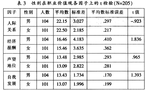 性别效应分析农村初中生职业价值观在性别上的效应用独立样本t检验进行分析,结果见表3。由表3可知,在职业价值观四个因子得分上,性别效应不显著(P>.05),但男生的平均得分除人际关系这一因子外,其余各因子都比女生高。这同国外Gribbons & Lohnes(1965)、Elizr(1994)的研究结论相似,即男生的价值观重“薪水报酬”,女生的价值观重“主管沟通”与“同事相处”。