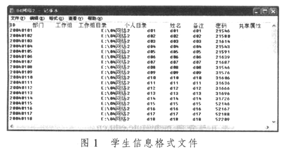 (一)用户可从网站http://goodsoft.diysever.net中下载“文件夹共享管理软件”(以下简称“管理软件”),通过“控制面板”的“添加/删除程序”安装在“C:\program files\”路径下,在“管理软件”下生成一个DATA文件夹,该文件夹就是用来存放上课的班级学生信息。在“管理软件”下还有一个文本文档,指明学生信息的格式,上课教师按此文本文档格式可生成每个具体班内学生的信息,将按此格式生成的文件保存在DATA文件夹下,以下是生成04网络2班学生信息,其各项数据可借助EXCEL电子表格自动生成,将文件命名为“04网络2”并保存在“C:\program files\DATA\”,其格式如图1。