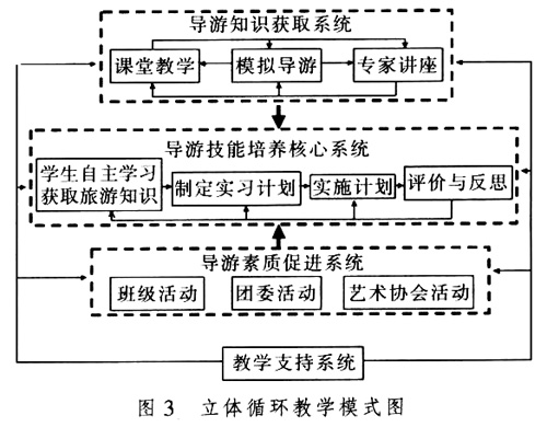 学生知识和能力的获得最终需要通过教学环节来实现。技能型导游培养教学环节针对导游培养的复杂性,优化教学各个环节,以提高学生导游技能为中心,我院提出了立体循环教学模式(如图3)。所谓立体循环模式是以培养导游技能为中心,吸收现代教育理念,针对导游培养的特色,在传统教学模式上优化而成。从内容上看,具有迸发性,方式上具有多样性,教学资源利用上具有广泛性,学校的一切教学资源都为培养学生的导游技能服务。[4]