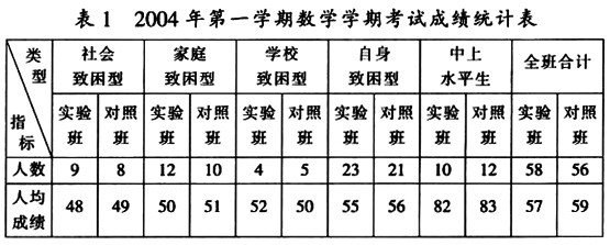 笔者在调查分析的基础上,对本校两个高职班进行实验。将其中一个班作为对照班,另一个班作为实验班,实施以情感教育为核心的转化策略,进行为期一年的转化尝试。在上新课前,我两个班2004年第一学期的数学学期成绩、“数困生”数量等数据进行了统计(见表1),实验班、对照班的平均成绩分别为57分、59分,实验班略低;“数困生”数量分别为48人、44人,实验班略多。总体而言,两个班的数学人均成绩和“数困生”数量没有显著差异。