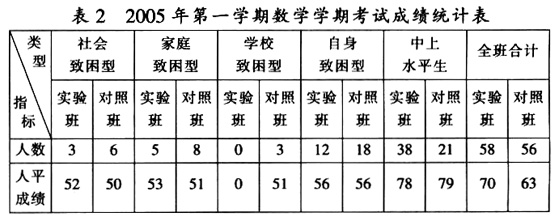 从表2可以看出,2005年第一学期数学学期考试中,实验班和对照班人均成绩分别为70分、63分,“数困生”数量分别为20人、35人。与2004年上学期相比,两个班的人均成绩提高幅度分别为22.8%和7%,实验班高出15.7%;两个班“数困生”数量分别减少了28人与9人,实验班比对照班多减少17人。转化结果说明,相对于对照班,实验班的数学成绩提高得更快,“数困生”数量减少得更多。通过调查还发现,实验班学生的数学学习情感更为积极,学生的数学素养、个性品质和综合素质得到更好的发展。