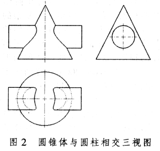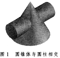 (一)从虚拟模型库提取圆锥与圆柱的相交体,观察其相贯线的空间形状,图1所示。