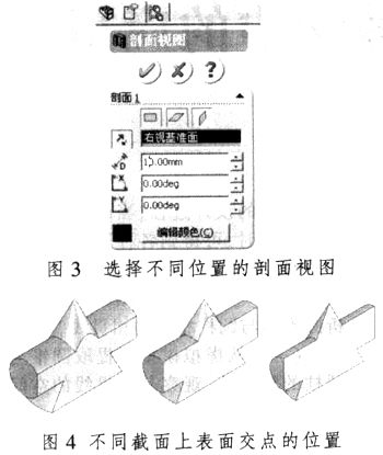 (三)通过剖面视图选择不同的截面位置,呈现不同截面上表面交点的位置,如图3、图4所示。