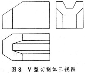 (一)根据图8所示V型切割体三视图,分析其外形轮廓基本上是长方形,想象出该组合体由一个长方体被切割掉若干部分所形成。