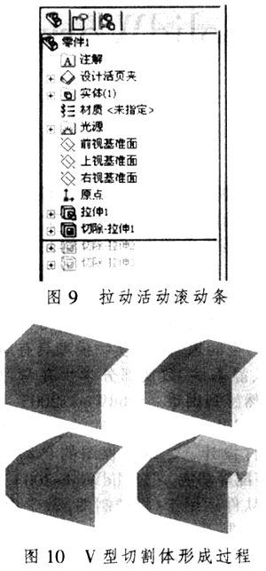 (二)根据线面投影特性,分析各个局部形状。应用SolidWorks2005,提取实体模型,在设计树下,拉动活动滚动条(图9所示),一步一步展示其切割体形成过程,图10所示。
