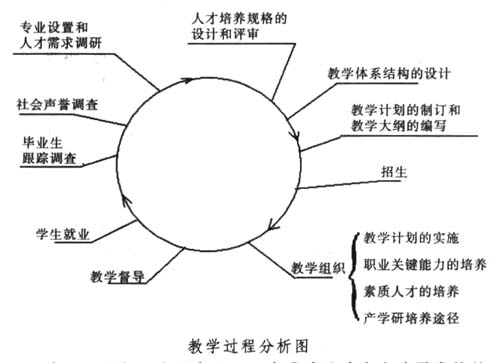 ISO9000族标准是建立在“所有工作都是通过过程来完成的”这样一种认识基础上的。当一个组织为了实施质量体系而进行质量体系策划时,首先要结合本组织的具体情况确定应包括哪些过程,然后分析每一个过程需要开展的质量活动,确定应采取的有效控制措施与方法。高职教育虽然有其自身的发展规律,但高职教育管理也是一项系统工程,在人才培养方面也需要全过程的质量管理。学校教学管理与具体教学工作是由一系列过程构成的:(1)市场调查与岗位分析;(2)培养目标的确立与人才培养规格和标准的确定;(3)人才培养方案设计;(4)课程体系建设、教学内容改革、教学设计;(5)教学组织;(6)学生就业;(7)毕业生跟踪调查。对教学过程的具体分析见下图。