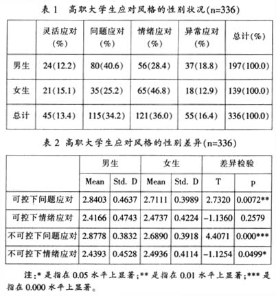 在336名高职大学生中,应对风格灵活与异常类的个体较少,而问题类与情绪类的个体较多;男生中最多的是问题类应对风格,女生中最多的是情绪类应对风格。
