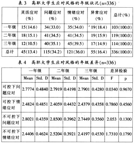 不同年级的高职大学生应对风格的差别不大,三个年级之间在四个维度上无显著差异。