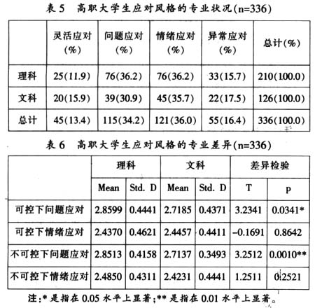 不同专业的高职大学生应对风格的差别也不大;理科学生与文科学生相比,倾向于在不同情境下采取问题应对策略,在不同的情境下采取情绪应对策略上,两者无显著差异。