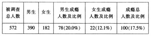 数据处理除去无效问卷,共有572份调查数据有效,其中男生390名,上网成瘾人数为78名,成瘾比例为20.0%,女生182名,上网成瘾人数为22名,成瘾比例为12.1%。上网成瘾总人数为100名,成瘾比例为17.5%。