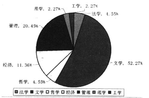 招生与报考情况三年来,湖南农业大学职业教育学硕士点研究生的招生,除教育学本科专业毕业生以外,可以说90%以上属于跨学科学生。学生中以文科专业为主,文学类学生最多,其次是管理和经济类本科学生,法学和哲学类学生再次之,较少的是理工科学生。而在文科专业中又以英语和汉语言文学方面的学生为最多。现有全日制研究生50人,其中学生专业分布如下: