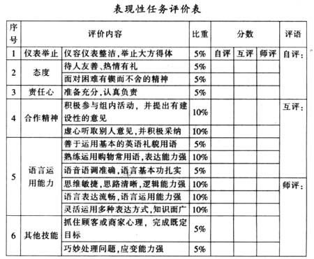 有助于学生学习需要的产生和学习动机的激发当所学内容是学习者所期望掌握的,并且其潜在价值又被充分了解时,学习者就会产生强烈的学习需要和动机。学生选择在中职学校学习英语是期望学到与外商洽谈生意的语言技巧,掌握处理英文文件的能力或运用简单英语与外宾会话的能力等。而过于抽象的理论测试让学生看不到英语的实际用途,学生就会觉得没有学习的必要,于是学习成了敷衍,考试成了应付,人才培养就成了一纸空谈。表现性评价是在具体情境中以学生的真实表现为评价基础的,对他们将来在工作中的表现有一定的预见性。表现性评价使学习目标清晰而具体地展现在学生面前,能最大强度地吸引学生学习。例如,在学习《Shopping》这一课前,教师宣布学习任务,让学生自由成组,模拟商品展销会进行推销和选购。学生对自己熟悉的一些日常商务活动表现出浓厚的兴趣,不但能主动学好课本中的句型,还要求教师再增加一些他们需要的词组和句型,或者自己去查找所需要的内容。在这样的实践中,学生变得主动,由“要我学”转变为“我要学”。