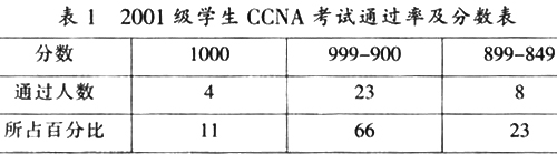 CCNA认证成绩喜人我们在网络2001级和2002级学生中进行了教学试验(共进行两轮),与2000级相比较,取得的成绩是明显的。到目前为止,2001级学生总计35人参加CCNA认证考试,一次通过率为100%,其中4人获得了满分,如表1所示(CCNA考试通过分数为849分)。而2000级只有5个人通过了CCNA考试。
