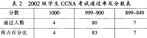 2002级参加考试的学生为96人,通过CCNA认证考试的为91人,其中4人获得了满分,通过率为95%,如表2。