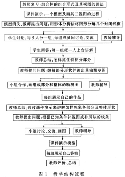 例如,关于“用形体分析法读图”的学习:(1)目标。培养学生空间想像力、多元智力和自主学习能力。(2)意义。通过课件演示、学生交流、教师讲解充分加强空间思维能力训练,不仅符合现代培养目标要求,而且可激发学生的学习兴趣和积极性。(3)教学结构流程如图1所示。