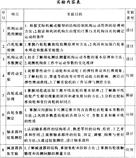 机械设计课程实验应有别于其他课程《机械设计基础》是一门综合性课程,需要《机械制图》、《金属工艺与材料》、《工程力学》及《公差与配合》等知识,学生必须具有扎实的基础理论和综合运用这些知识的能力,而这些课程的实验都有其独立性,实验的方法和操作要求也各不一样,这些实验既不能互相代替又不能重复。实验的内容应根据课程的重点和难点而定。根据高职高专的课程特点,具体试验的内容见下表: