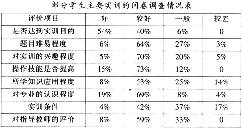 按照上述思路进行实施,取得了良好的教学效果。各种专项和综合技能实训提高了学生的操作技能,一些实训项目在实施过程中遇到了意想不到的实际问题,激发了学生的积极性和创新性,提高了学生的工程实践能力。下表为对部分学生主要实训的问卷调查结果: