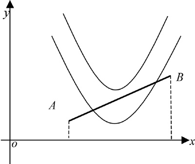 例4.已知点A(1,1)、B(3,3),若抛物线y=x2+ax+2,(a∈R),与线段AB有两个不同的交点,求a的取值范围。(如图5所示)