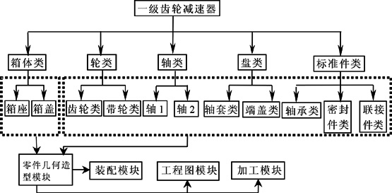 准备阶段(1)布置本次实训要完成的项目、实训目的、要求和具体任务。任务按Pro/E提供的功能以模块方式布置,共有四个模块:零件几何造型、零部件装配和总体装配、工程图创建、数控加工。(2)教师与学生一起分析减速器工作原理和零部件的特点,画出减速器的零件组成结构,确定所属模块图,如图2所示。(3)将学生分成几个小组,每组6~8人,以小组为单位制定项目实施计划,包括确定完成任务的方法、步骤、时间安排和每个人的具体任务分工;教师与各组学生一起修改完善实施计划,最后确定计划。(4)准备好减速器实物模型、资料、手册、测量仪器等。(5)确定减速器各零部件尺寸,由各组自己决定实物测量方法或自己设计减速器各零部件尺寸。