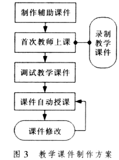 与传统的多媒体教学不同,本方案的优点体现在其自身的四个关键点上。(1)教师不是单一个体,而是课程的教研组团队。虽然首次开课的教师是由本课程教学中非常有经验的某教师(如某个教授)担任,但课件的录制、调试和改良工作是教研组团队一起完成。(2)用于自动播放课件的录制、修改和播放的软件操作非常简易。录制生成的课件不是VCD类型,而是存储容量小,修改非常方便的特殊软件类型,课件以时间轴为主线,以音频的一句话为基本单位,能实现音频和视频同时修改。课件播放时交互性强,前进和后退以音频的一句话或若干句话一次性定位,能随时暂停却又不会停在一句话中间,可随时增加需显示的文字和图形等。(3)课程的多次开课,直接由课件自动播放完成授课全过程。任课教师充当教学秩序组织者、课时课后学习辅导者和学生学习情况观察者的角色。(4)教学效果评定科学。教学效果由组织上课的多名教师负责评定,评定包含若干可见的硬指标(如学生学习情况、作业情况、成绩情况等)。