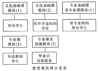 要实现中专与高职、普高的衔接与沟通,就应在课程安排上采用模块式结构。首先,按专业分块,再根据学生的不同要求和目标建立微型模块群。如下图所示: