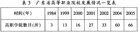 2005年66所高职院校的教职工为21555人,其中专任教师14625人;本科院校的教职工为49112人,其中专任教师为30739人。高职院校的教职工是本科院校的43.9%,高职院校的专任教师是本科院校的47.6%,高职院校专任教师中具有高级职称的人数为3700人,本科院校专任教师中具有高级职称的人数为13095人,高职院校专任教师中具有高级职称的人数仅为本科院校的28.3%。高职院校专任教师中具有研究生以上学历的人数为2998人,本科院校专任教师中具有研究生以上学历的人数为15577人,高职院校专任教师中具有研究生以上学历的人数仅为本科院校的19.3%。新设置的高职院校师资队伍过于年轻化,初级职称教师比例过高,“双师型”教师比例达不到要求。据调查统计,广东高职院校教师队伍中具备高技术素质的“双师型”教师比例不足15%,距离教育部规定的高职院校师资队伍中“双师型”优秀教师要占专任教师80%以上的目标相距甚远。