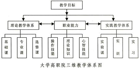 根据大学高职院的办学定位和人才培养目标,我们认为,单纯强调理论、实践或能力的教学体系都是不适合的,应建立以职业能力培养为核心,同时涵盖理论教学与实践教学的三维教学体系。具体而言,大学高职院三维教学体系是以学生综合职业能力培养为核心,强调理论教学体系的基本性、实践教学体系的针对性,充分运用现代教育技术手段,培养知识厚、技术全、能力强、素质高的高级技术型人才,由职业能力、理论教学、实践教学三个维度为主体构建而成的教学体系。其中,职业能力是三维教学体系的核心,理论教学与实践教学都围绕它进行运作,三者之间相互联系、相互促进,共同服务于大学高职院的人才培养目标。其构成具体如下图所示。
