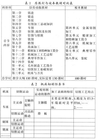 2005~2006学年,我校对2005级数控机加工专业进行了全面的课程设置改革,使用校本教材。笔者负责校本教材《机械制造工艺基础》的编写工作。在认真分析原有教材优缺点的基础上,对教材的知识内容进行了大面积的分解重组,突出教材的适用性、有效性,使教材面貌有了很大改变,主要体现在以下方面:(1)将原教材中属于热加工工艺的铸造、锻造和焊接三个章节的内容合并为一个单元,介绍常见的毛坯制造方法与过程,并对机械加工类专业必须了解的有关影响机械加工方法和质量的毛坯材料机械性能、毛坯上常见缺陷等内容进行大胆地删减,减少了学时。(2)将原教材第五章到第十章有关各种机床的切削加工和第十一章有关精密、特种加工的知识内容进行分解重组,分别安排为介绍机床构造、刀具类别和介绍金属切削加工方法及其工艺特点这两个单元。(3)保留原有的切削加工基础知识、机械加工工艺过程、典型零件加工和装配工艺章节,各自成为独立单元,作为校本教材的重点知识内容。