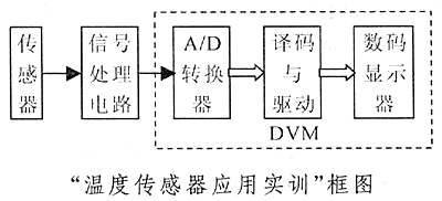 实训及课程设计相对于实验来说,实训和课程设计要难得多,但也是最能锻炼学生技能的环节。在实训教学过程中,由3~5个学生组成一个小组,以小组为单位组织实训。教学采用循序渐进的方式,由简单到复杂逐步加大难度。例如,“温度传感器应用实训”项目的实现框图如右图。在该实训的教学中,若所有的电路都让学生去做,难度较大,有的学生能做出来,而有的学生会觉得实训太难而退缩。因此,我们在实训时,对于后面的三个部分不要求学生去做,用数字电压表来代替,学生只需要做前面两个方框,即传感器的选择和信号处理电路,学生的主要精力转移到传感器的选择与信号处理电路的设计与制作、调试上来,难度降低很多。而接下来的实训则逐步要求部分学生做出全部电路,并能正确调试电路,直到完成相应物理量的测量。